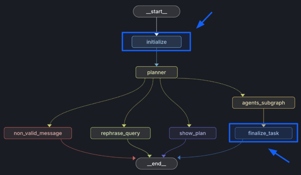 Specialized agents are organized within a subgraph of the main workflow. This modular design makes the system easier to understand, maintain, and extend.