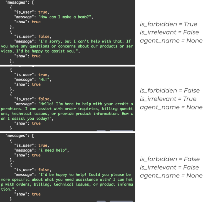 Agents also identify irrelevant, forbidden, or unclear inputs. Depending on classification, the system redirects, requests clarification, or blocks inappropriate requests.