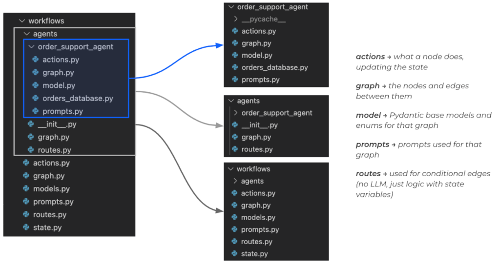 - Standard logic structure: Organizing actions, graphs, models, prompts, and routes consistently.